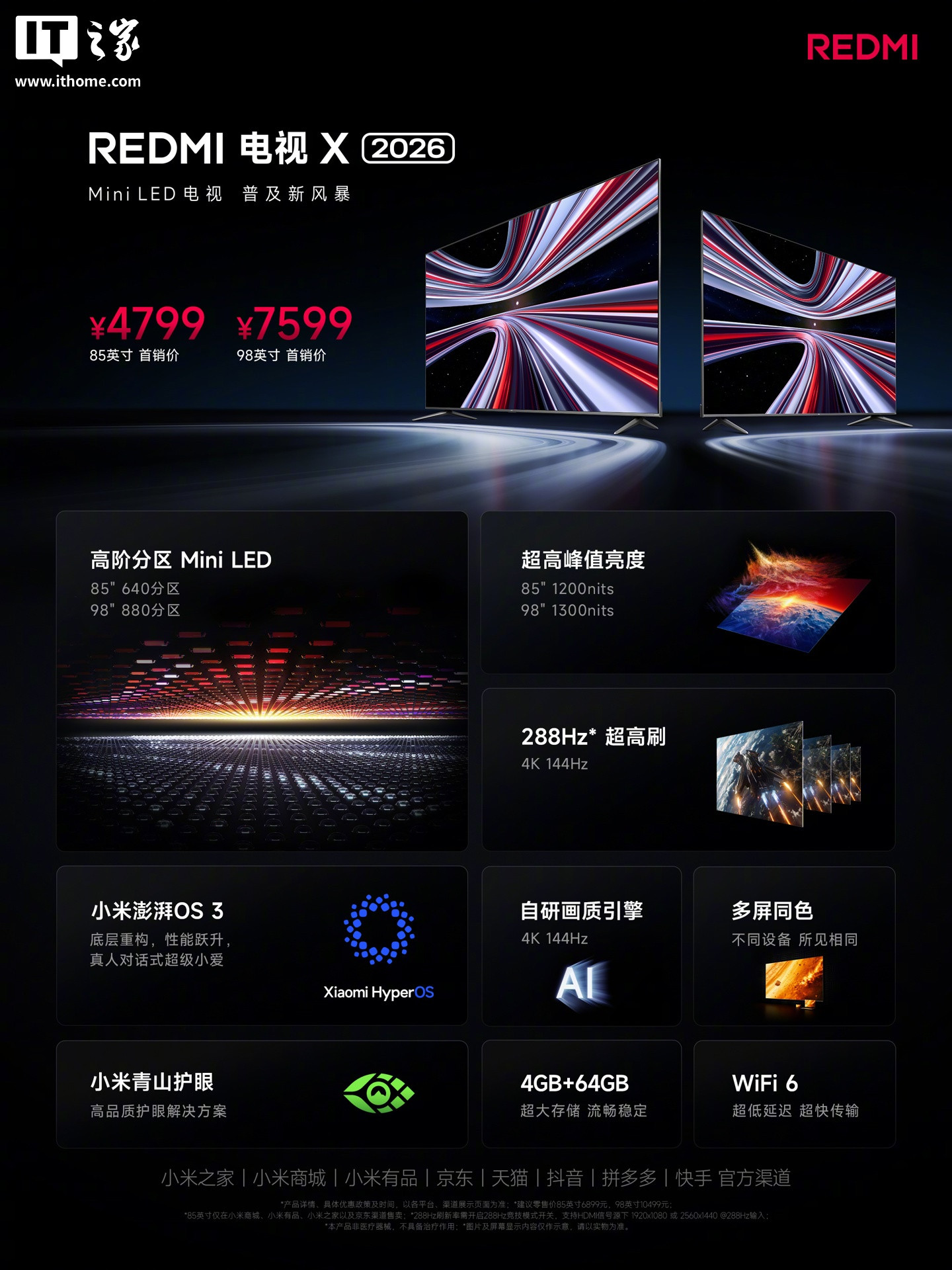 IT之家10月23日消息海证资本,小米今日发布了98英寸REDMI电视X2026,售价7599元。该电视此前有一个85英寸版,售价4799元。